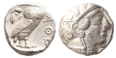 Grécia, Attica, Atenas, Tetradrachma, Circa 454-404 BC. Prata. Kroll 8; HGC 4, 1597. Sob/FC. 17.13g; 22mm. Anv: Cabeça de Atena com capacete à direita; Rev: Coruja em pé à direita, cabeça voltada para cima; ramo de oliveira e crescente atrás, ATHE à direita da coruja; tudo dentro de um quadrado incuso. Cabeça de Athena inteira (incluindo um belo nariz) e parte da crista do capacete também visível. Se não a mais, uma das mais emblemáticas moedas de toda a numismática mundial. Bem batida, centrada, nariz completo, muito atrativa