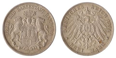 Alemanha, Hamburg, 3 Mark, 1914J. Prata. KM# 620. FC. Maravihosa, mantendo a cor original da prata com uma bela pátina dourada