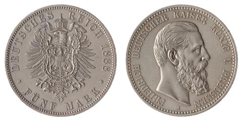 Alemanha, Prussia, 5 Mark, 1888A. Prata. KM# 512. Sob/FC. Leve limpeza antiga mas ainda retendo algum lustre original. Linda e rara nesse estado