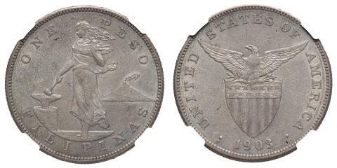 Ilhas Filipinas, 1 Peso, 1903S. Prata. KM# 168. NGC AU58. Primeira data da primeira série com peso 26.8g e 38mm de diâmetro (módulo grande). Cunhada em São Francisco. Escassa nesse estado. Muito atrativa